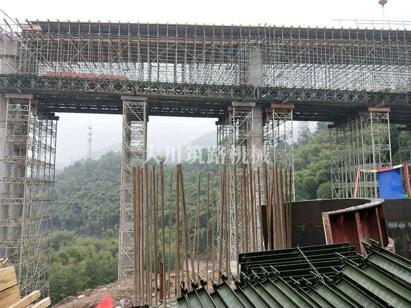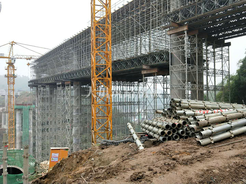 特點(diǎn):現(xiàn)澆梁支架平臺的跨度大,高度高,使用的貝雷片數(shù)量達(dá)到1808片,加強(qiáng)弦桿2800根,工程于2017年9月開始施工。